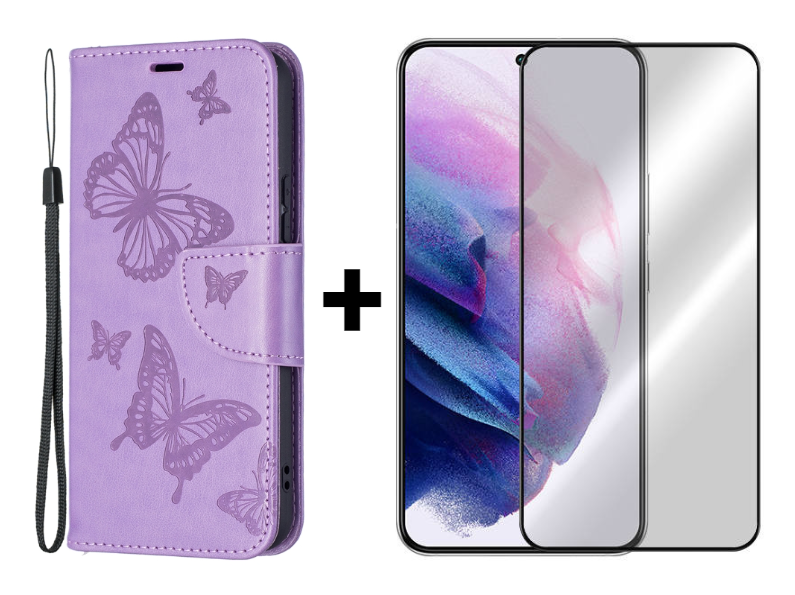 SKLO + PUZDRO 2v1 pre Samsung Galaxy S22 - Knižkové Butterflies fialové